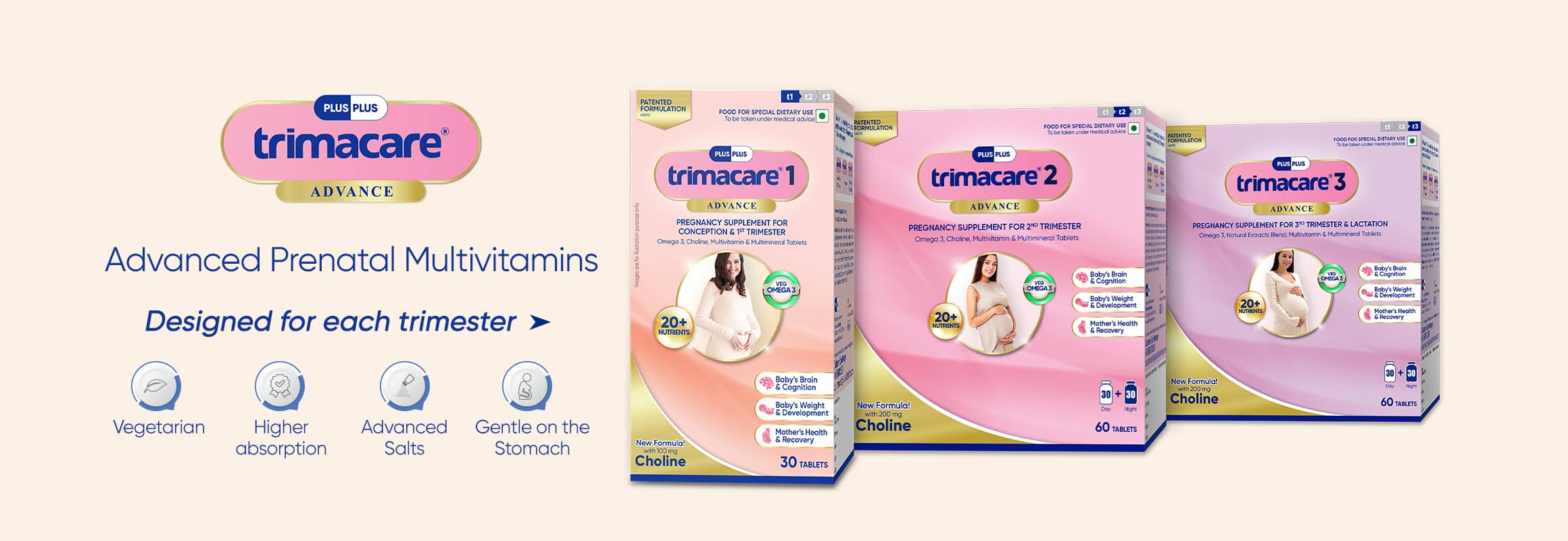 Trimacare™ Advance is a scientifically formulated, trimester-wise prenatal supplement, developed specifically for Indian pregnant women, following WHO and ICMR guidelines. It contains 20+ essential nutrients and is recommended by leading obstetricians and gynaecologists across India.